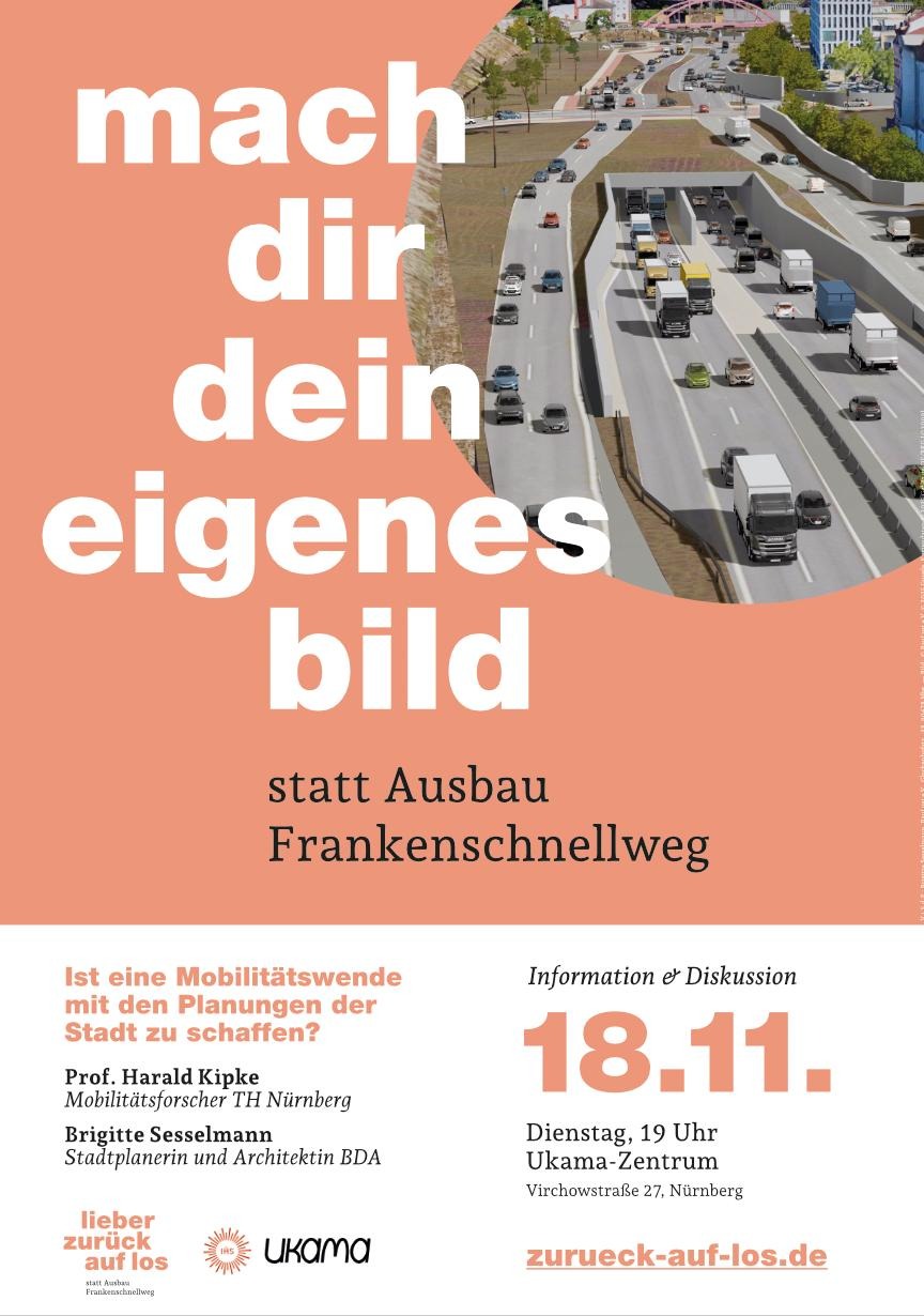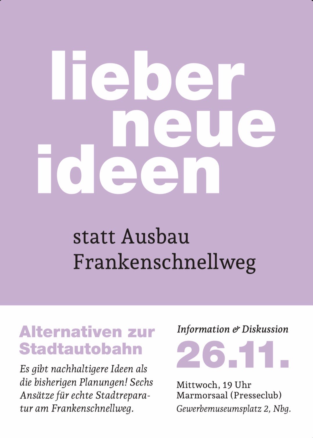 Jeden Freitag nachmittag (13 – 18 Uhr) in der Karolinenstraße gegenüber Thalia kann man sich über die Planungen der Stadt Nürnberg zum Ausbau Frankenschnellweg informieren, Infos und Unterschriftenlisten abholen, abgeben und selbst unterschreiben.